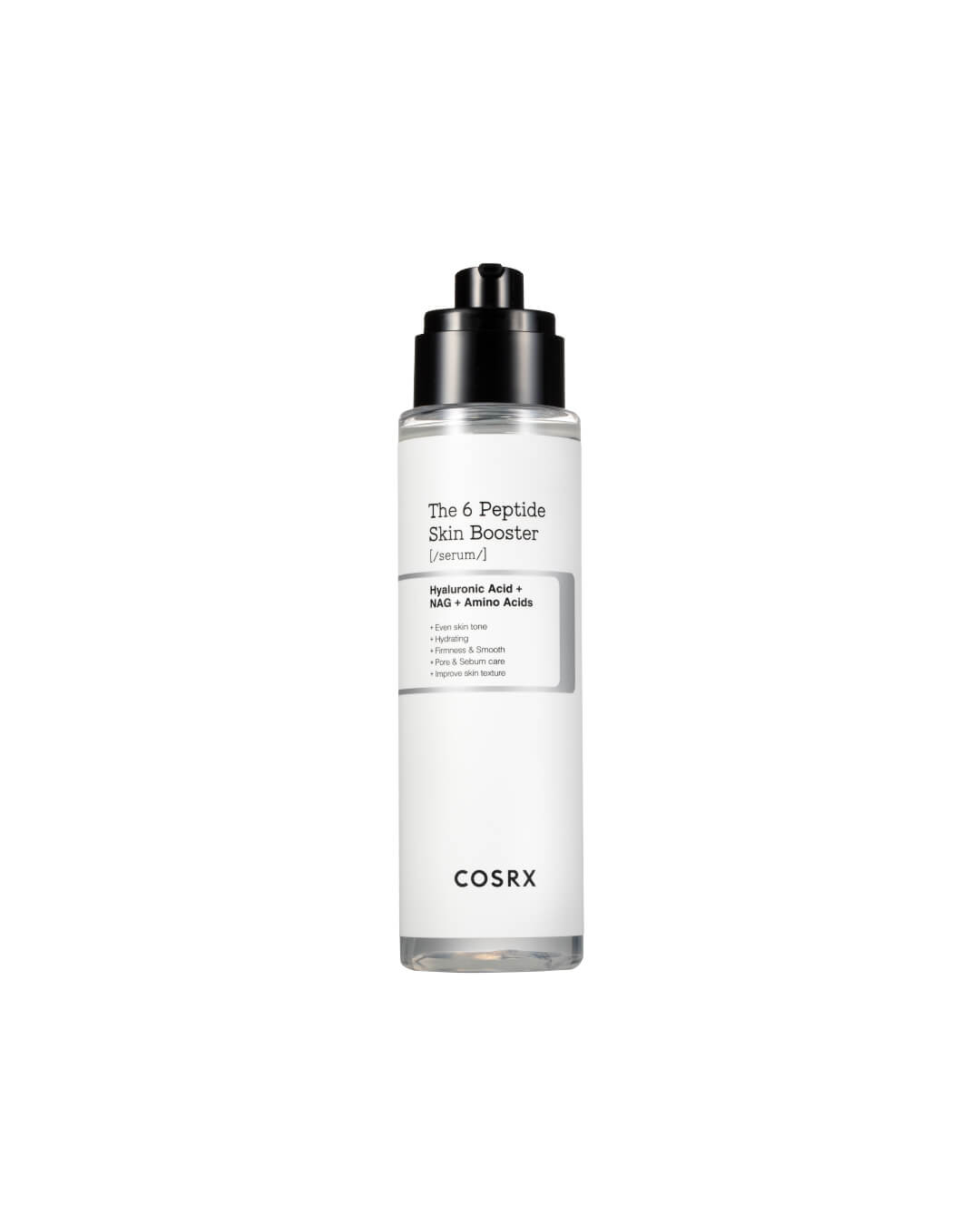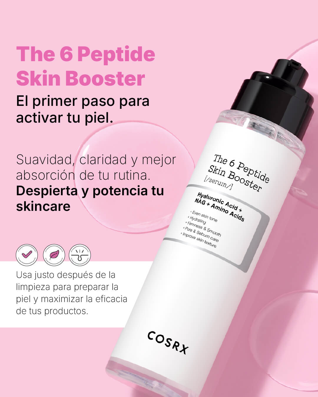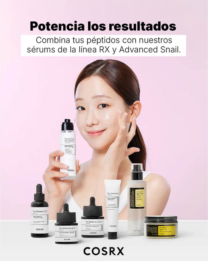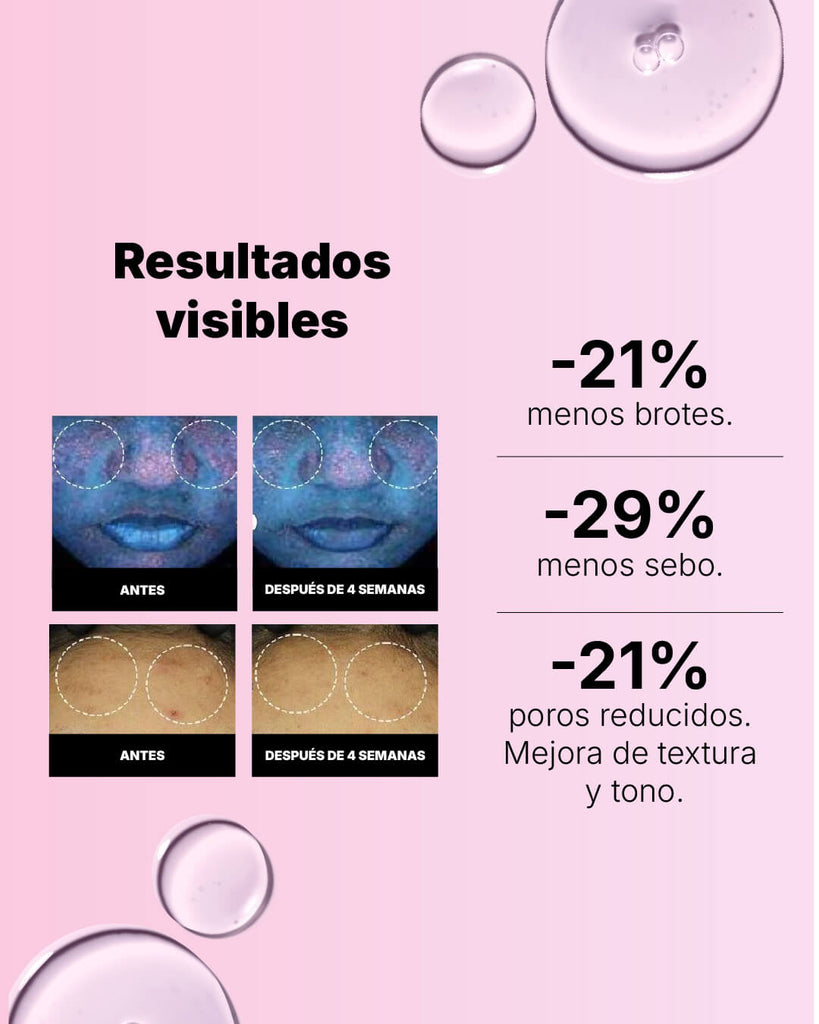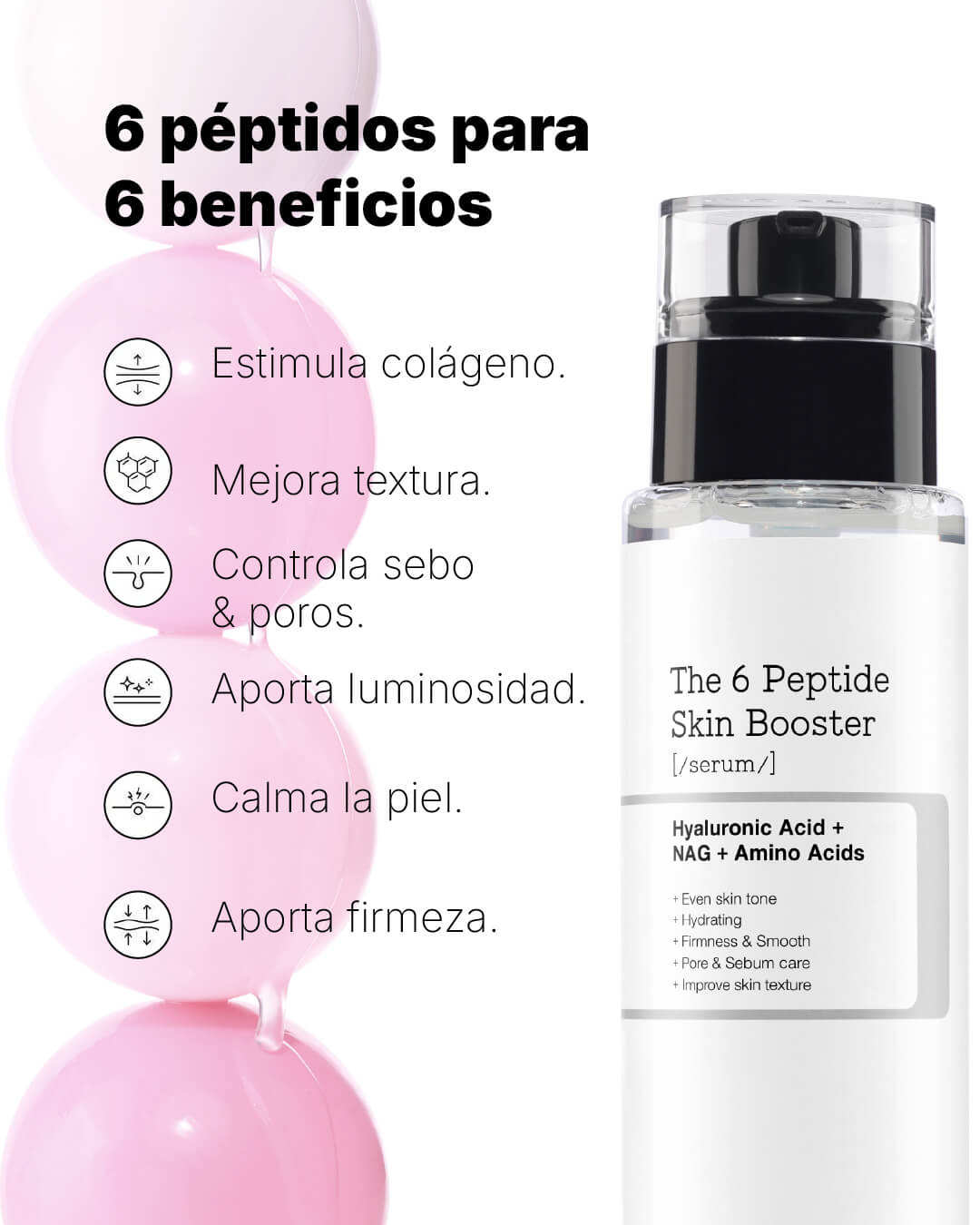 Suero ligero con 6 péptidos multifunción que mejoran visiblemente el estado general de la piel: control de poros y sebo, firmeza, líneas finas, textura, tono y calma.