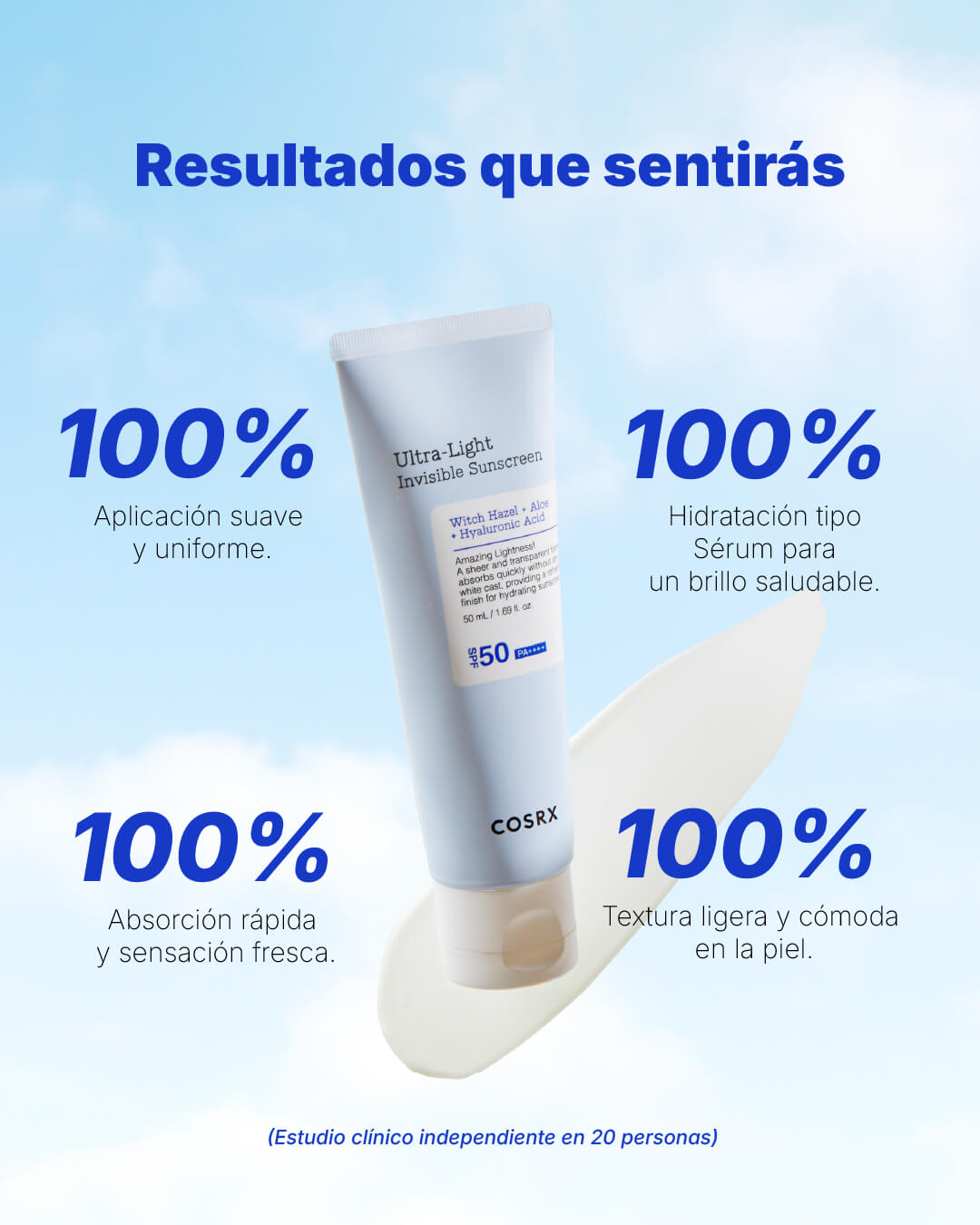 Fórmula transparente y de rápida absorción que no deja residuo blanco y proporciona un acabado fresco e hidratante. Perfecta para uso diario y todo tipo de piel, incluso las más sensibles.